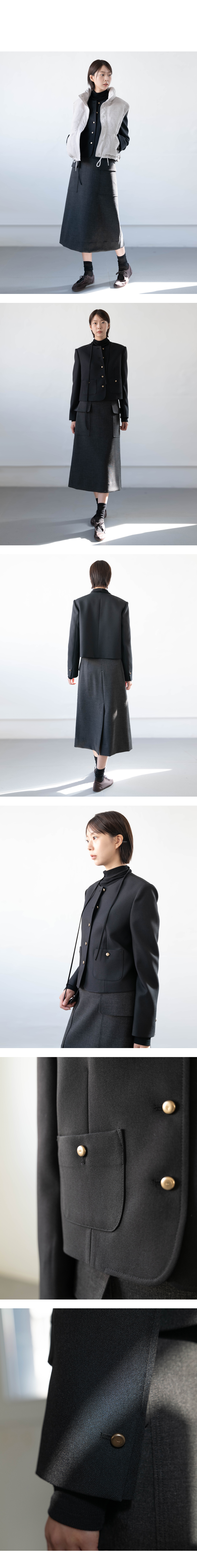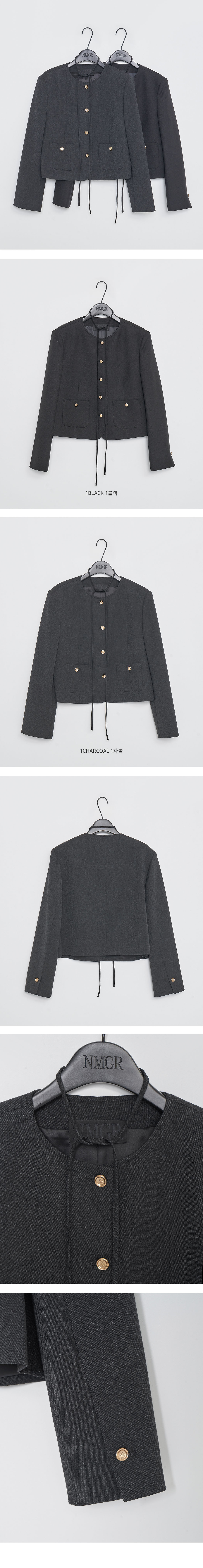 군더더기 없는 노카라 디자인이 우아하면서도 세련된 실루엣을 연출하며, 은은하게 빛나는 금장 버튼 디테일이 럭셔리한 포인트를 더합니다.