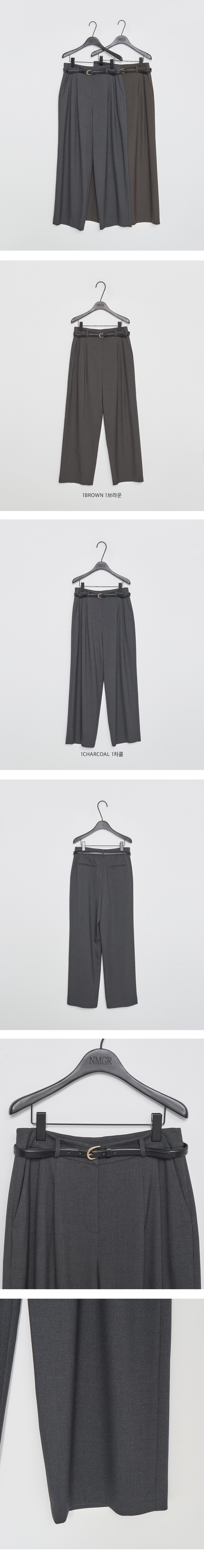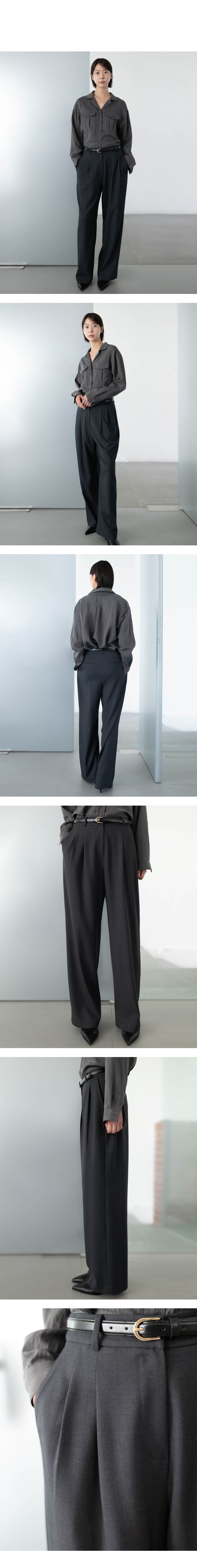 프론트 투-핀턱을 잡아 입체감을 연출해주었고 레더 소재의 벨트를 함께 구성하여 포인트 액세서리로 매치했습니다.